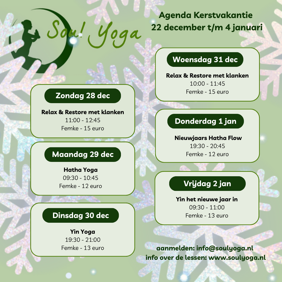 De les bestaat uit restorative houdingen, adembewustzijn en yoga nidra. Begeleid met heerlijke klanken. Totaal gericht op ontspannen, ontladen, opladen en herstellen.